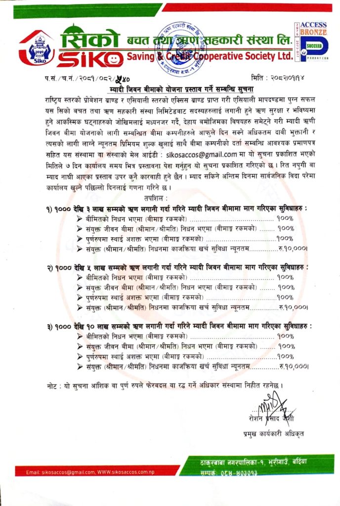 म्यादी जिवन बीमाको योजना प्रस्ताव गर्ने सम्बन्धि सुचना ।