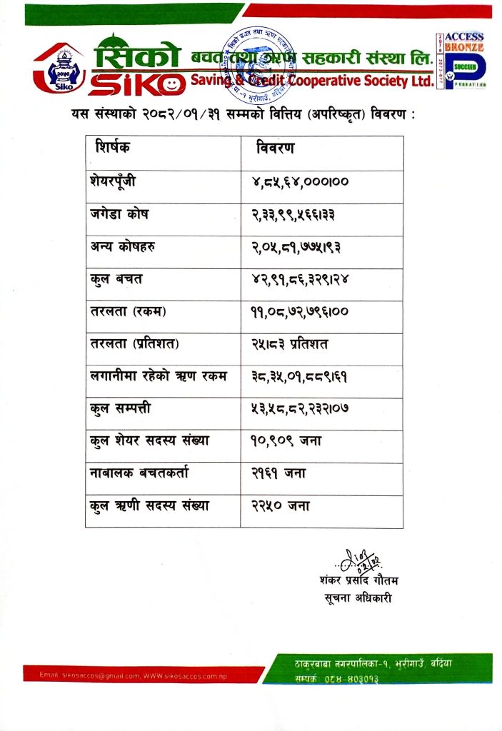 सहकारी विभागको मिति २०७९/०४/३१ गतेको निर्देशन नम्बर ८ बमोजिम शेयर सदस्यहरु तथा सरोकारवालाहरुलाई जानकारीको लागि २०८२।०१।३१ गते सम्मको वित्तिय विवरण प्रकाशित गरिएको छ ।