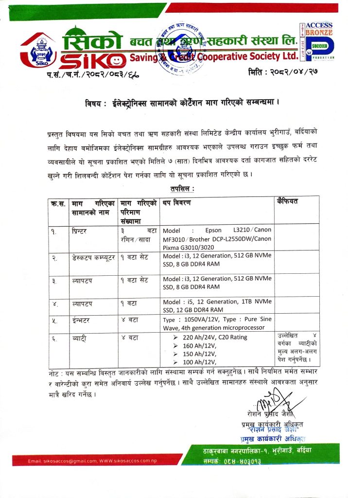 इलेक्ट्रोनिक्स सामानहरूकाे कोटेशन माग गरिएको सम्बन्धि सूचना