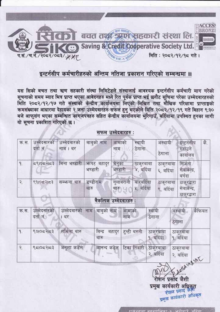 इन्टनसीप कर्मचारीहरूको अन्तिम नतिजा प्रकाशन गरिएको सम्बन्धमा !!!